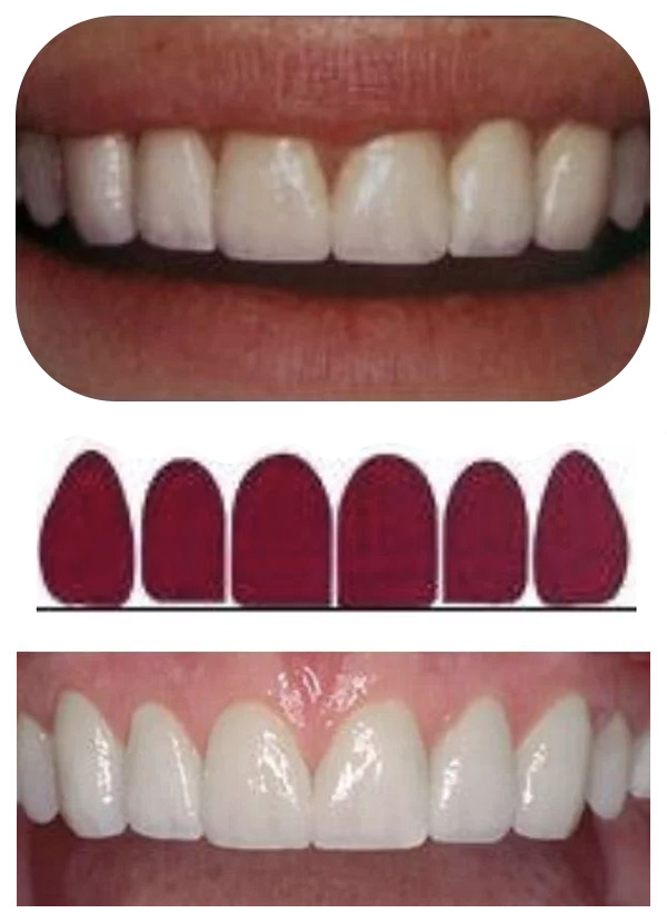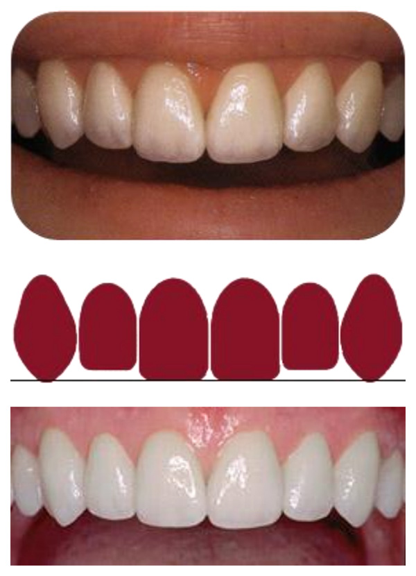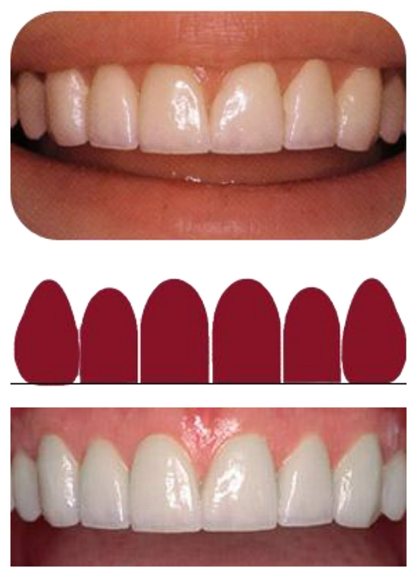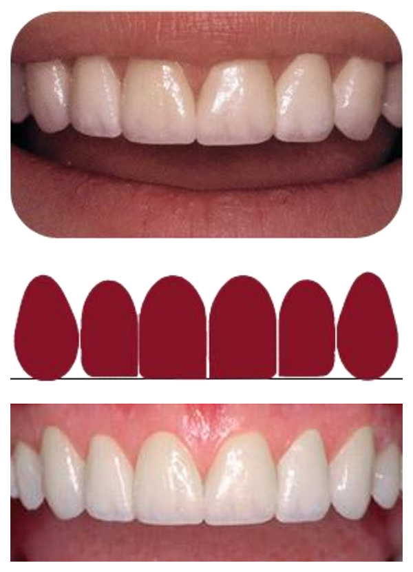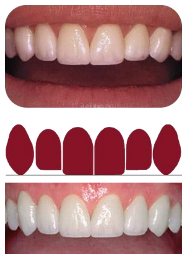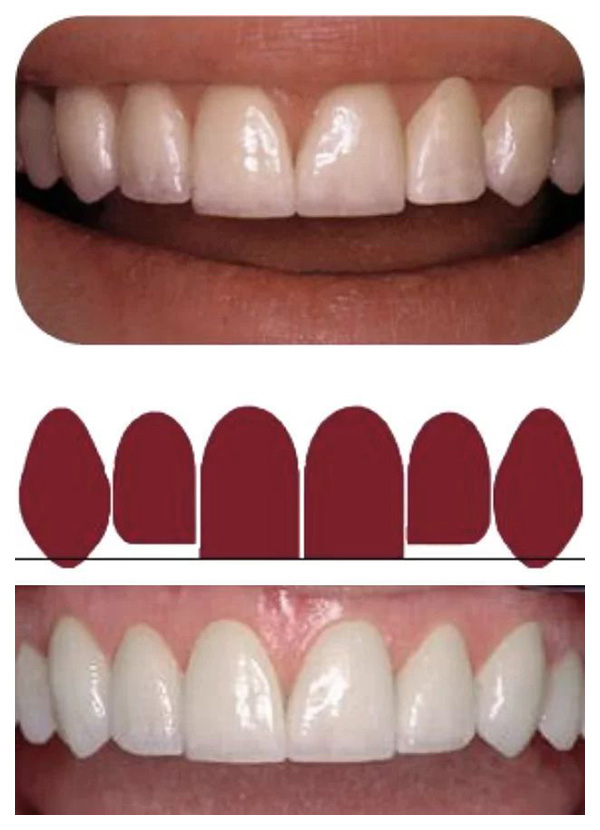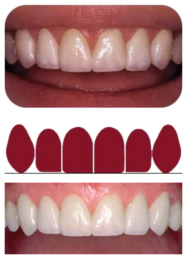 This design is a favorite for people who want a beautiful smile but don’t want to look too ‘cosmetic’. The centrals are slightly rounded on the outside edges as well as the laterals. Note that the second teeth from the center are a little shorter than the front teeth. This is a youthful effect we call “the gull wing” that really looks nice on females. The cuspids have been flattened and given a rounded shape. The Enhanced Smile is perfect for the person who wants to have an exquisite, elegant appearance.